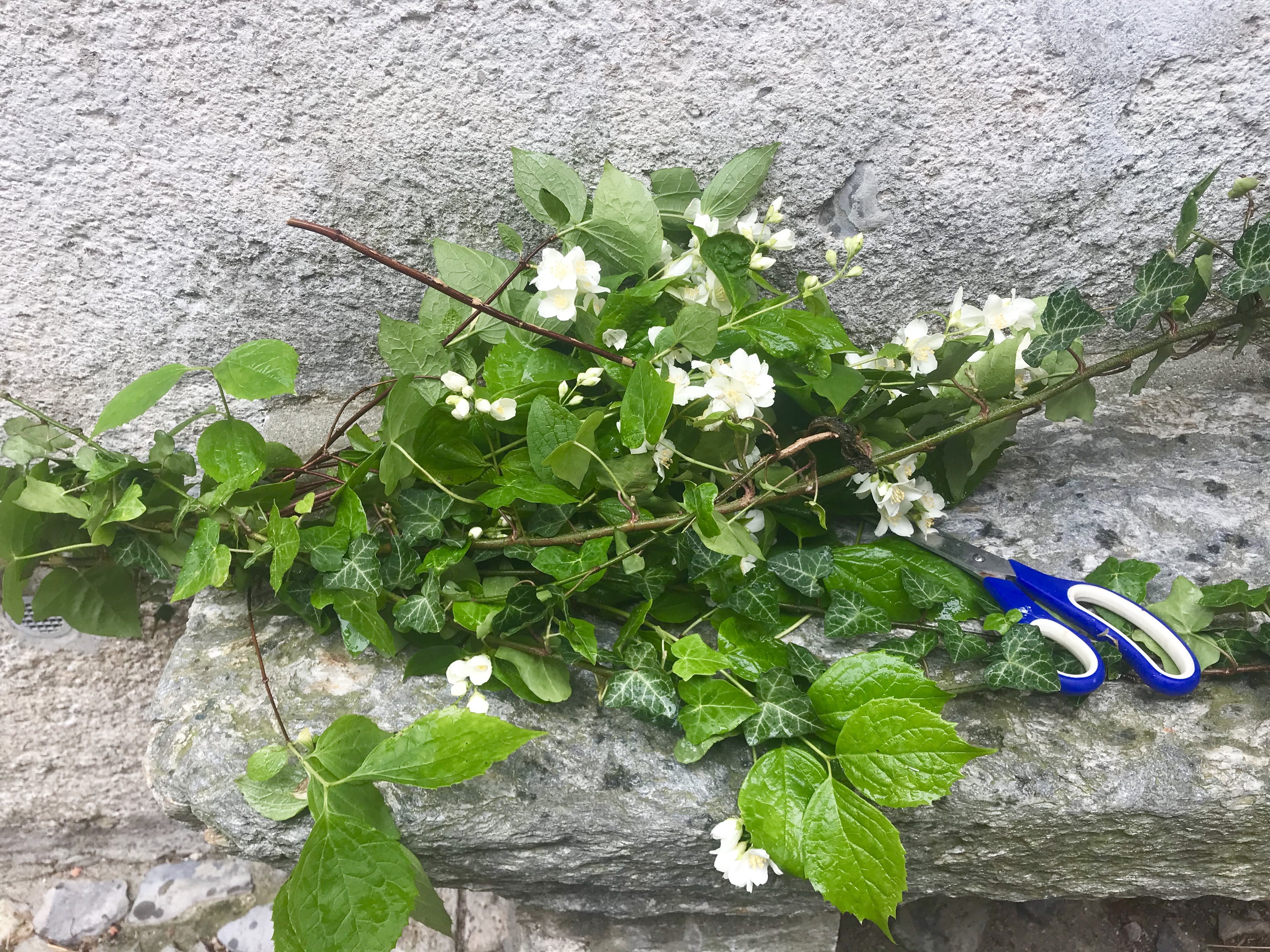 Passeggiando in paese alla ricerca dei tralci di EDERA, in un giardinetto abbandonato ho trovato dei bellissimi rami di FIOR D’ARANCIO in piena fioritura. Mi sembravano proprio adatti all’occasione; la decorazione della tavola per il pranzo doveva essere solo temporanea, semplice da eseguire ma di grande impatto onde creare una bella sorpresa per la famiglia!