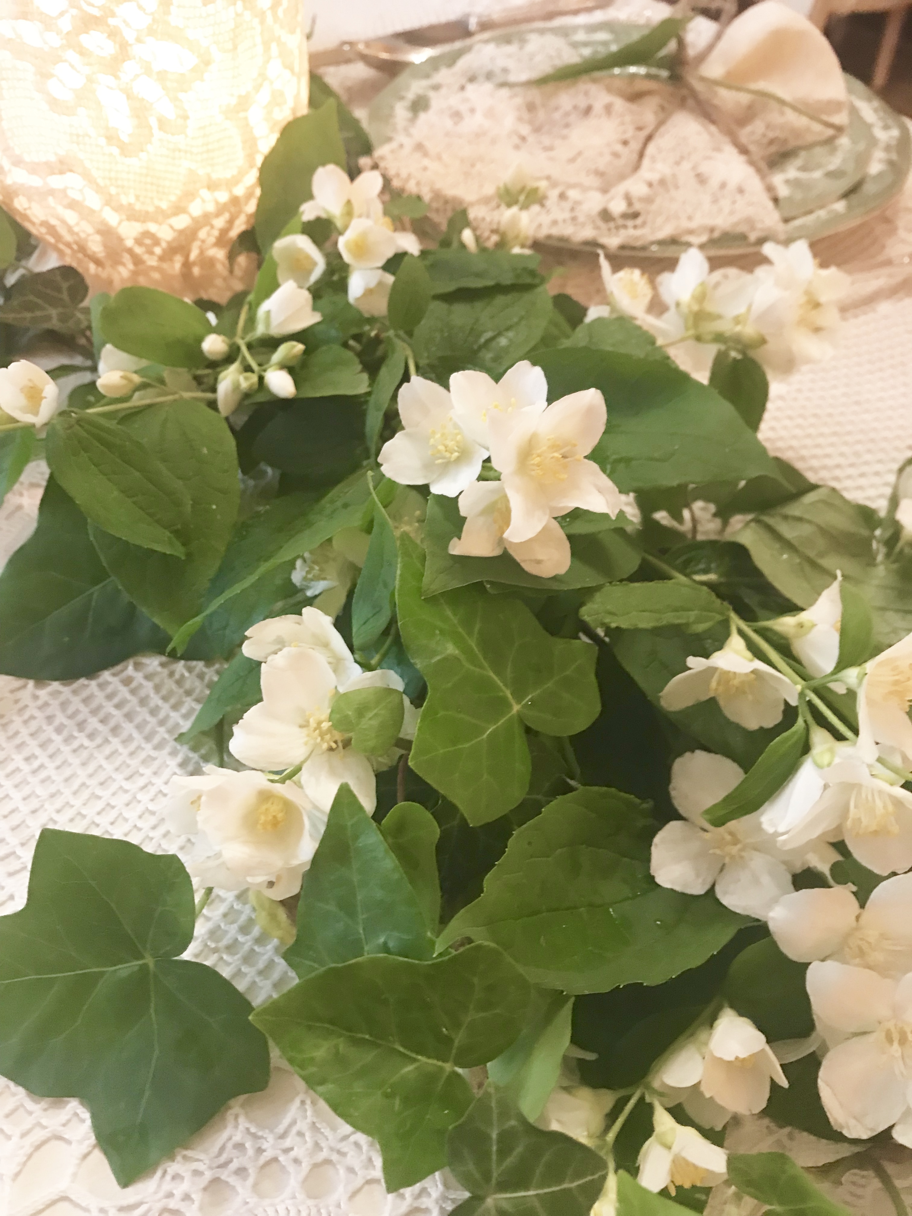 Dopo il portacandele, il “pezzo forte” della decorazione, ho iniziato a creare la composizione floreale con 4 tralci d’edera e dei rami fioriti di fior d’arancio che tra l’altro hanno un profumo davvero delizioso. Ho posato i rami semplicemente sul tavolo senza infilarli nella spugna dei fioristi e neppure senza legarli insieme tanto la decorazione doveva durare solo per questa specifica occasione. Infatti dopo il pranzo con i rami ho creato un bouquet per decorare la credenza del tinello. La tavola doveva contenere solo i piatti, posate e bicchieri oltre alla decorazione centrale e cosi tutto il cibo è stato tenuto su un tavolino separato. In questo modo la composizione totale della tavola diventa una piccola l’opera d’arte TEMPORANEA che ti fa gustare il pranzo prima con gli occhi e poi con la bocca!