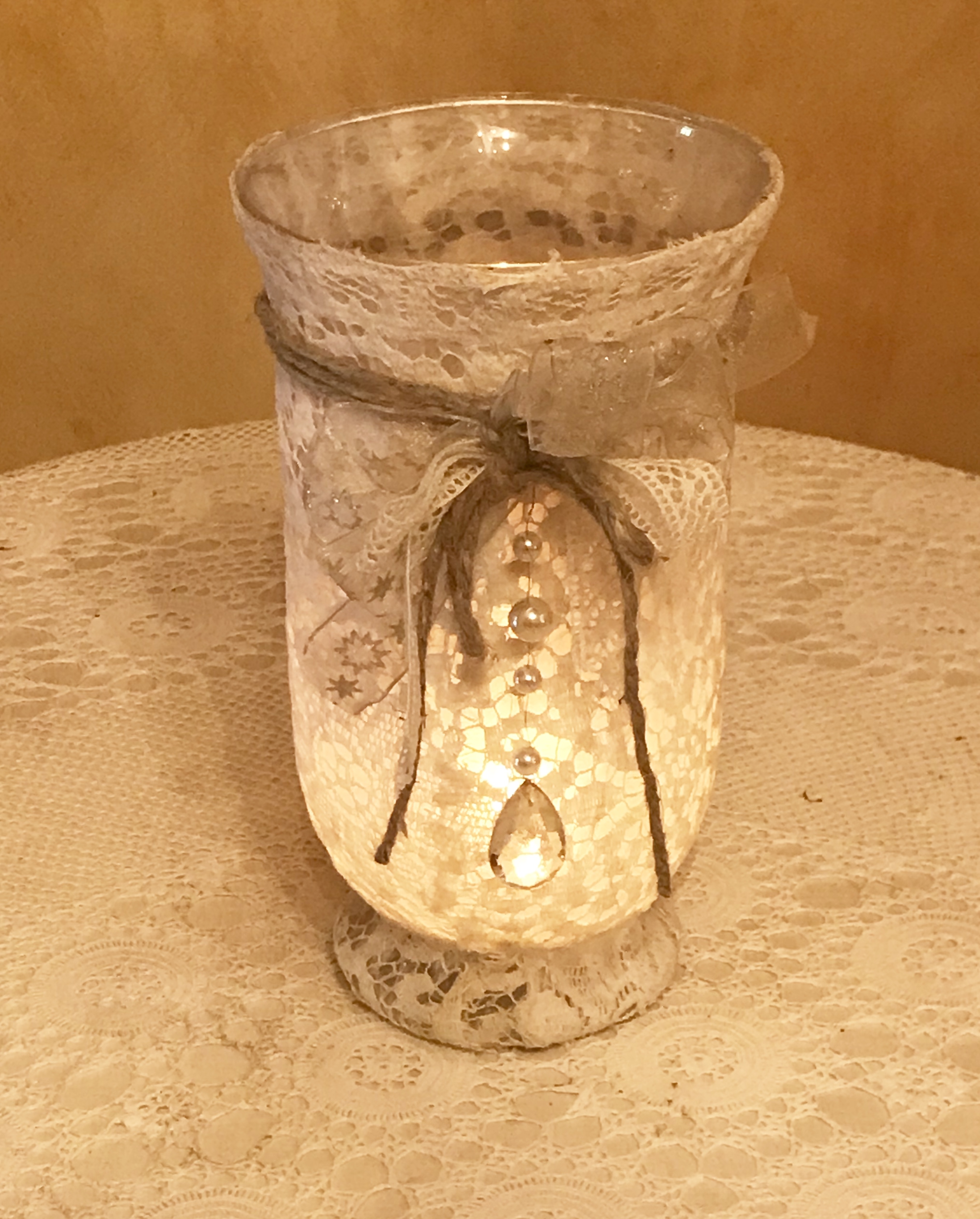 Il “leitmotiv” di questo pranzo era il creare un ambiente ROMANTICO nelle tonalità di bianco e verde in stile D’ANTAN. Cosi ho iniziato la preparazione della tavola con una vecchia tovaglia di pizzo perfettamente in tema. In seguito ho collocato al centro della tavola un portacandele di vetro ricoperto di pizzo della produzione di Curkumina. La luce delicata della candela accesa attraverso il rivestimento in pizzo ha creato proprio quell’ambiente romantico che volevo ottenere. Questi portacandele li potrai trovare più avanti nel SHOP di Curkumina appena questo si apre nella sezione ad esso dedicata del BLOG.