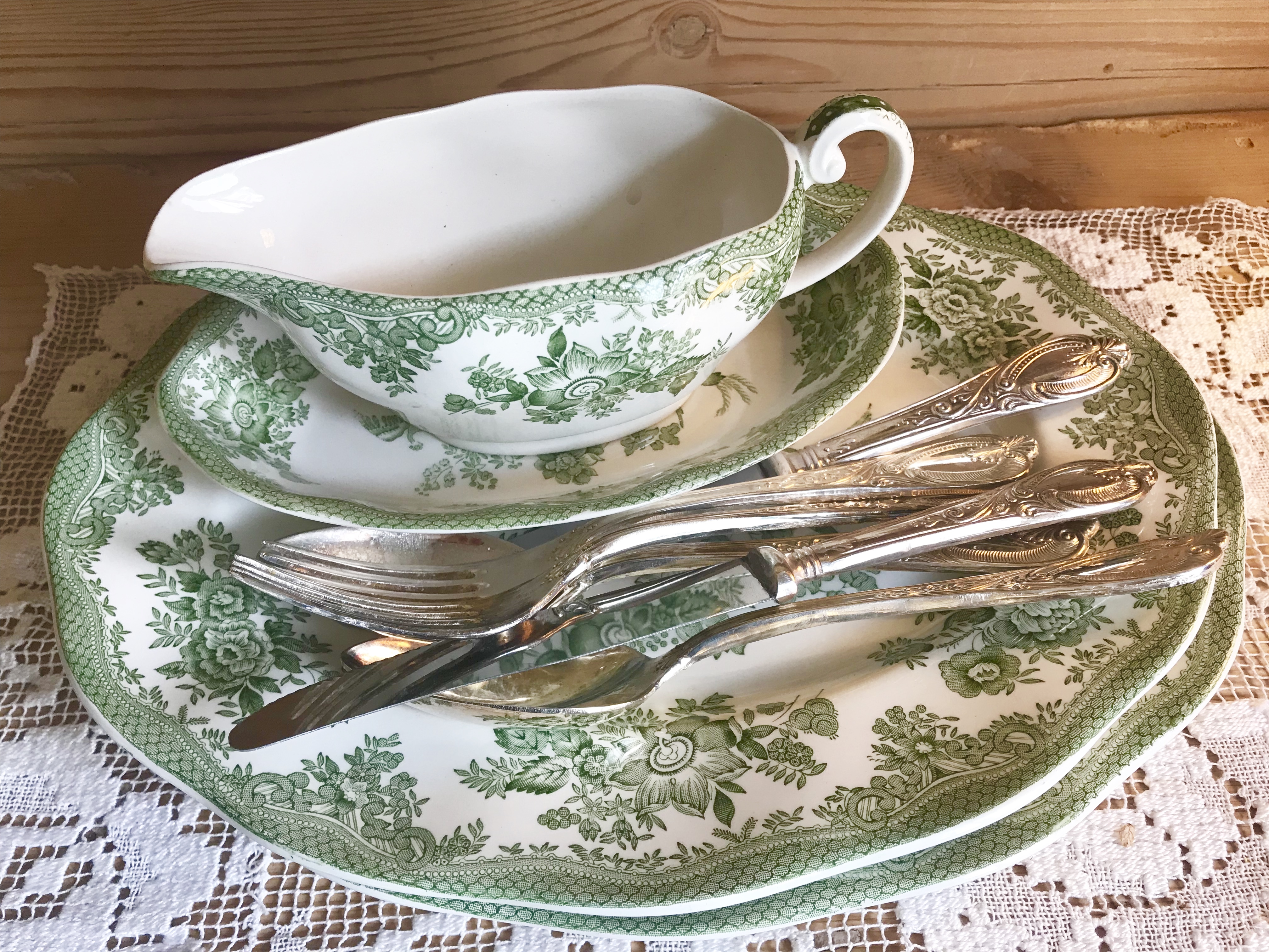 In quanto ai piatti, ho apparecchiato la tavola in tinta con la decorazione che ho voluto creare usando un servizio vintage inglese nelle tonalità di bianco/verde. Se hai letto i miei articoli precedenti (La zuppa di salmone – nella zuppiera “souvenir d’antan”) sai della mia “passione” per i piatti d’antan. Questo servizio di piatti l’ho comperato qualche mese fa in Olanda, naturalmente in un negozio di “brocantage”…