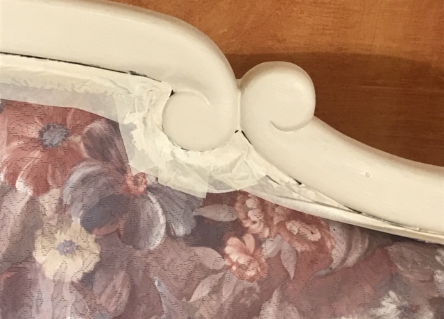 Per prima cosa ho dovuto dipingere la struttura in legno del divano e della poltrona. Con lo scotch di carta (quello che usano gli imbianchini) ho coperto tutti i bordi della stoffa per evitare che si sporcassero e così ho iniziato l’avventura di trasformazione di questi mobili: 2 mani color panna, poi “effetti speciali” nelle due tonalità color lino per creare un invecchiamento imitando antichi mobili francesi.