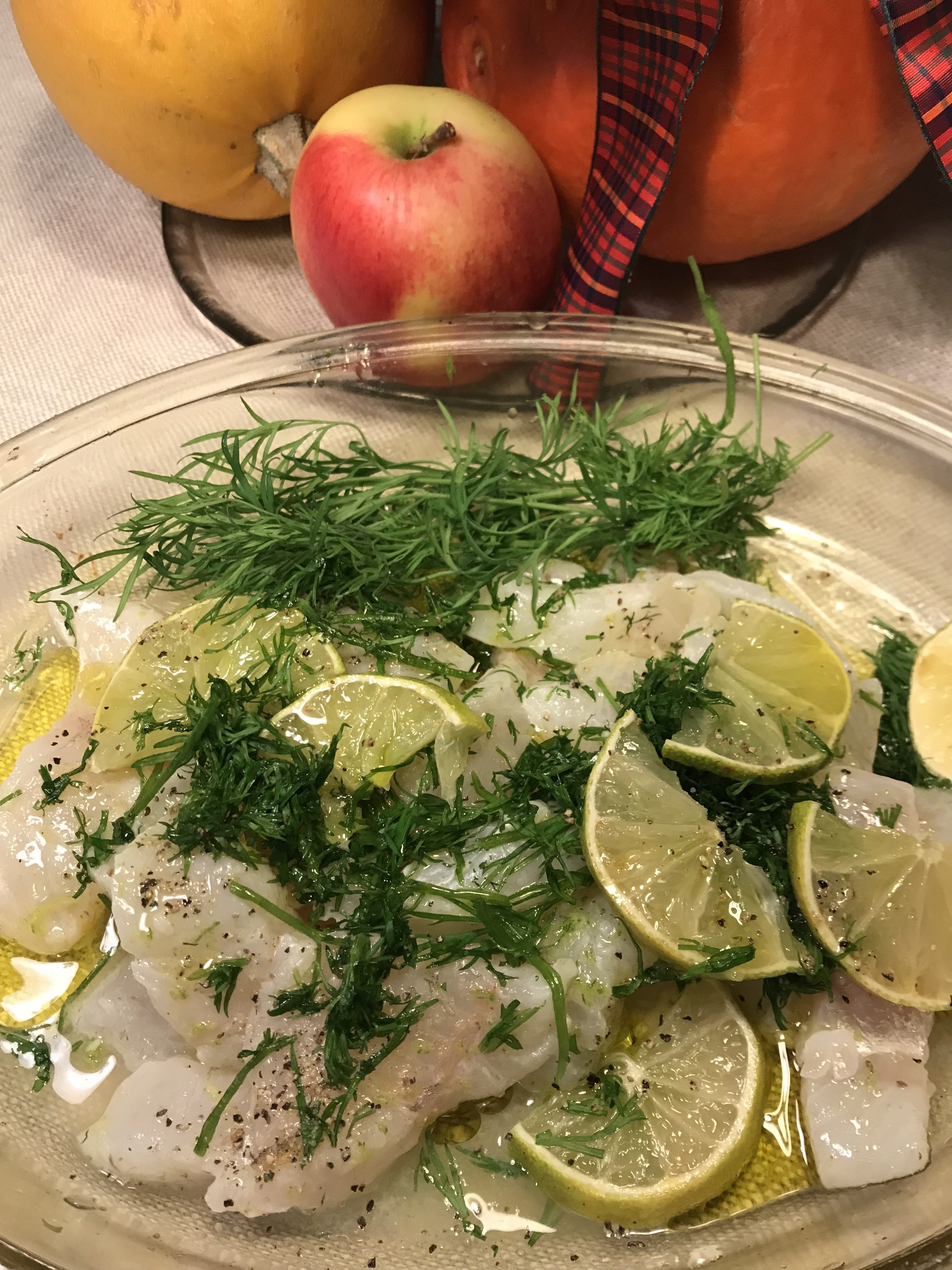 - Mettere il pesce a marinare con la scorza grattugiata di un lime, il succo di 1-2 lime, cipolla, pepe, sale, 3-4 cucchiai di olio d’oliva e la metà dell’aneto. Lasciare riposare per circa 30 minuti.